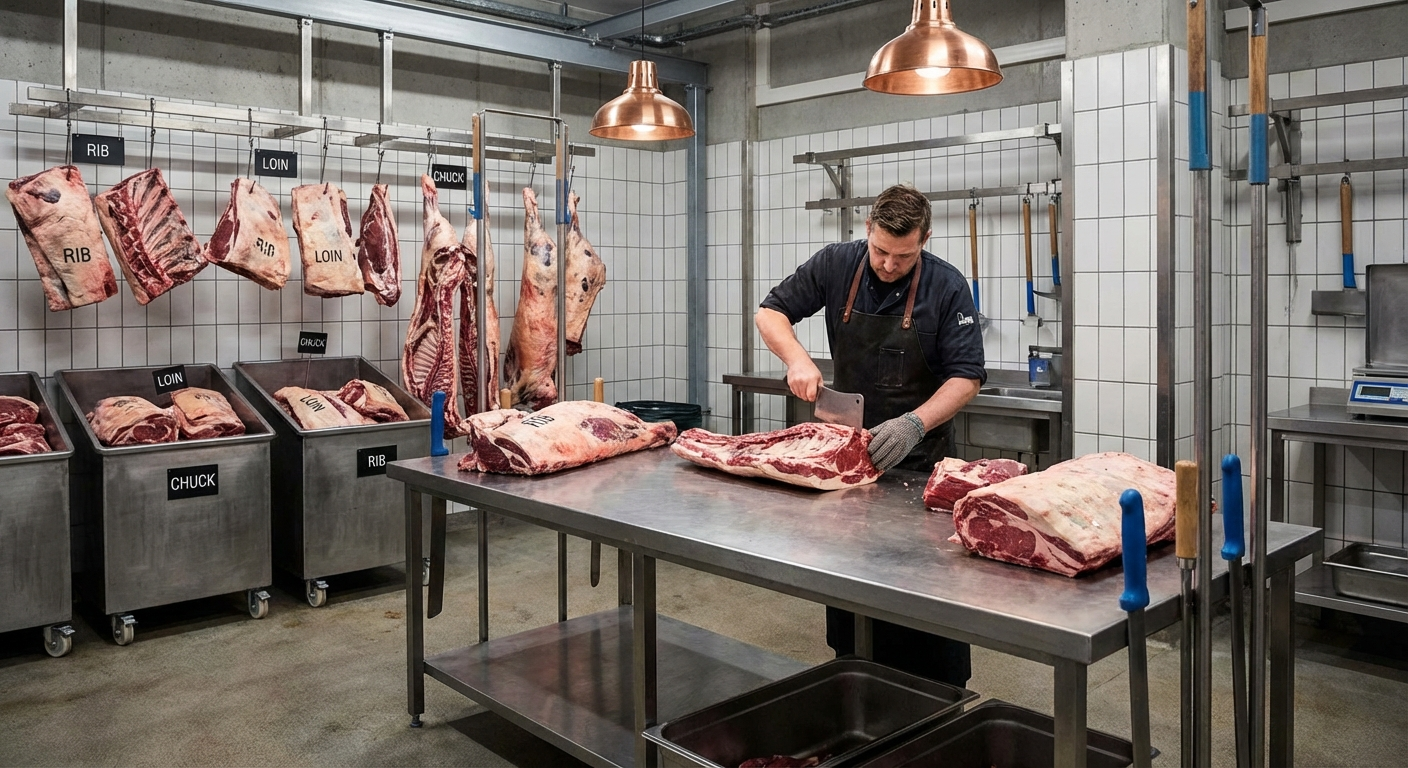 A master butcher's complete guide to breaking down a whole beef — from initial hanging to final primal separation, with detailed techniques for each step.