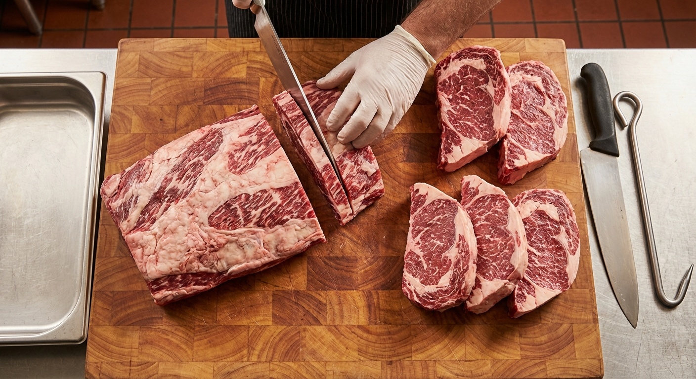Buying a whole ribeye and cutting it yourself saves 30-50% over buying individual steaks. Here is exactly how professional butchers break down a boneless ribeye primal into perfect steaks every time.